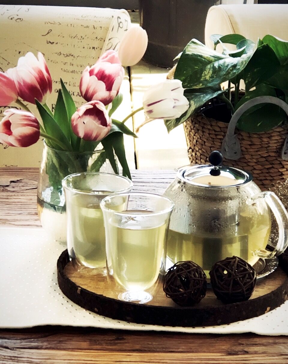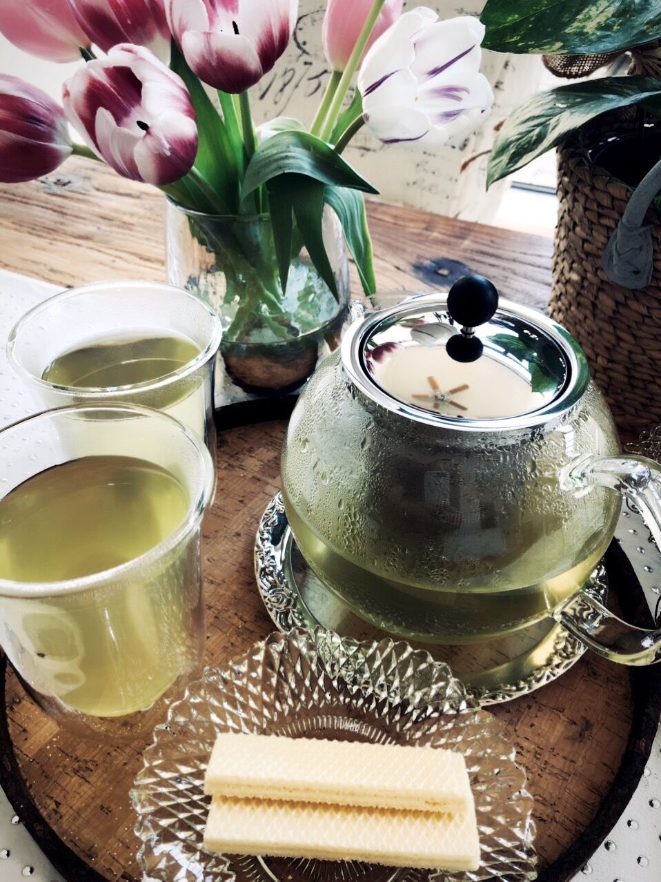 コルクのトレイにのせて、緑茶のお茶請けはなぜかウエハース。。。。