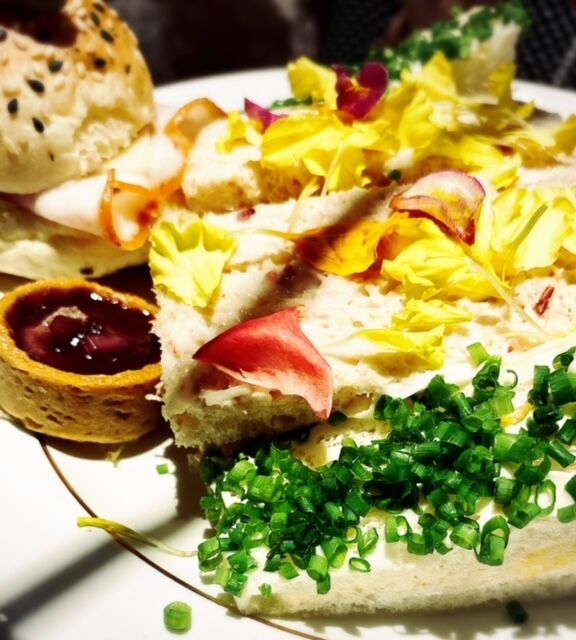 ターキーのサンドイッチの上には、なんと花びらが。。。まあ、非日常的な光景だこと。笑